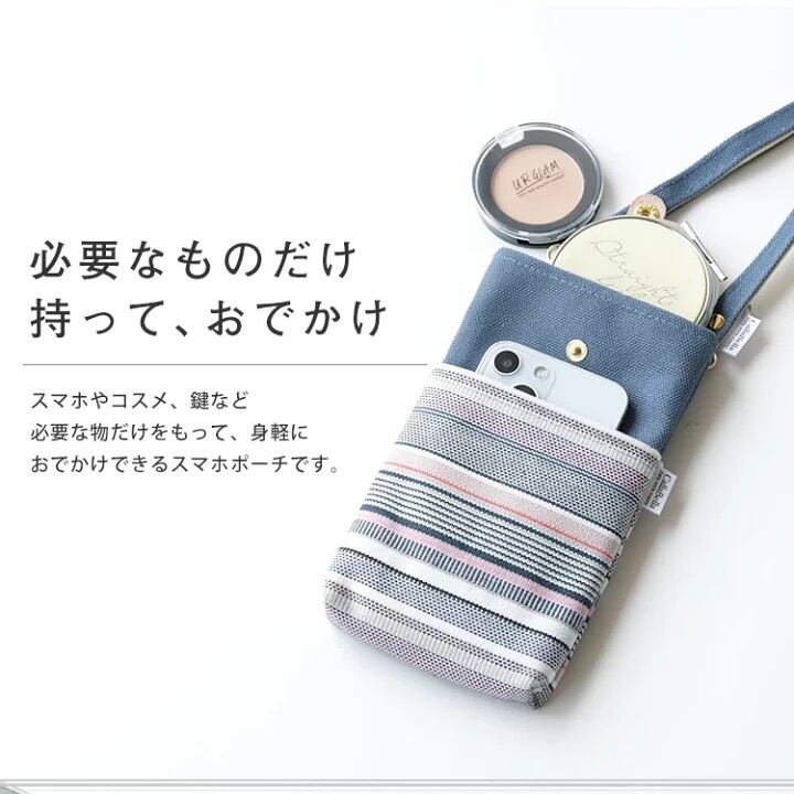 ボーダーの色と帆布の色の組み合わせに拘ったオシャレで便利なスマホポーチです。